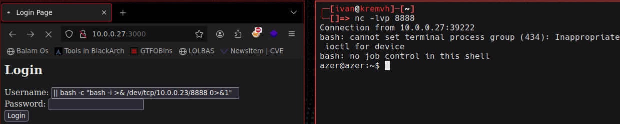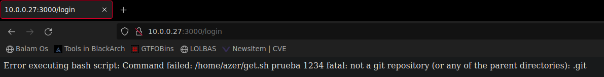 Efectivamente, es vulnerable a inyección, una explicación de como ha funcionado el comando anterior: El servidor node cuando recibe una petición ejecuta el comando /home/azer/get.sh <usuario> <contraseña>