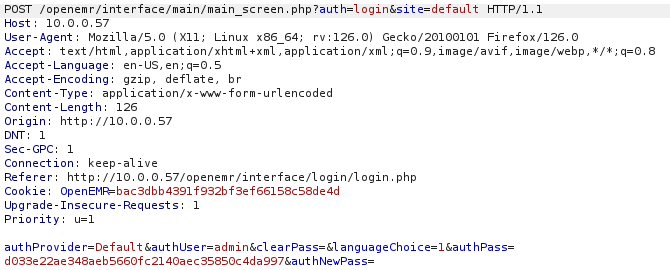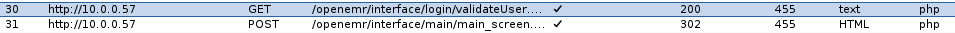 Vemos que se realizan dos peticiones, la primera solicita a validateUser.php un usuario en un parametro GET u=<usuario> La respuesta a esa consulta es una Cookie de OpenEMR La siguiente solicitud es una peticion POST con los siguientes datos